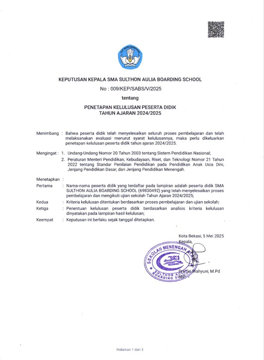 Berdasarkan Surat Keputusan Kepala SMA “SULTHON AULIA BOARDING SCHOOL” Nomor 009/KEP/SABS/V/2025 tanggal 5 Mei 2025 tentang Penetapan Kelulusan Peserta Didik Tahun Ajaran 2024/2025 dan hasil rapat pleno guru dan kepala sekolah pada tanggal 5 Mei 2025, SMA “Sulthon Aulia Boarding School" telah menetapkan kelulusan siswa-siswi tahun ajaran 2024/2025 sejumlah 55 orang.